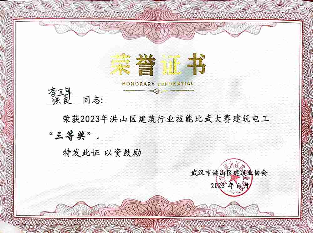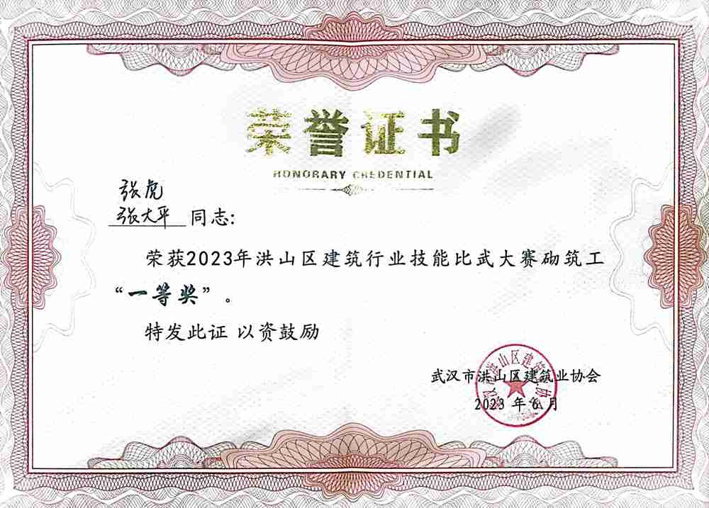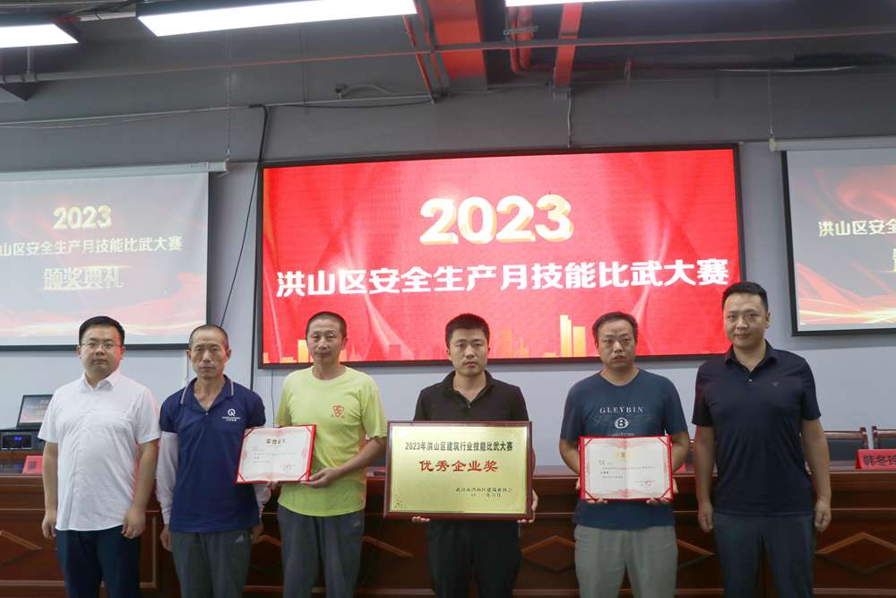經過一上午的激烈角逐,大賽成功決出個人和團體獎項。集團公司張虎和張大平兩位同志榮獲2023年洪山建筑行業技能比武大賽砌筑工“一等獎”,集團公司李衛軍和洪良兩位同志榮獲2023年洪山建筑行業技能比武大賽電工“三等獎”,區領導還為集團公司頒發了2023年洪山建筑行業技能比武大賽“優秀企業獎”。